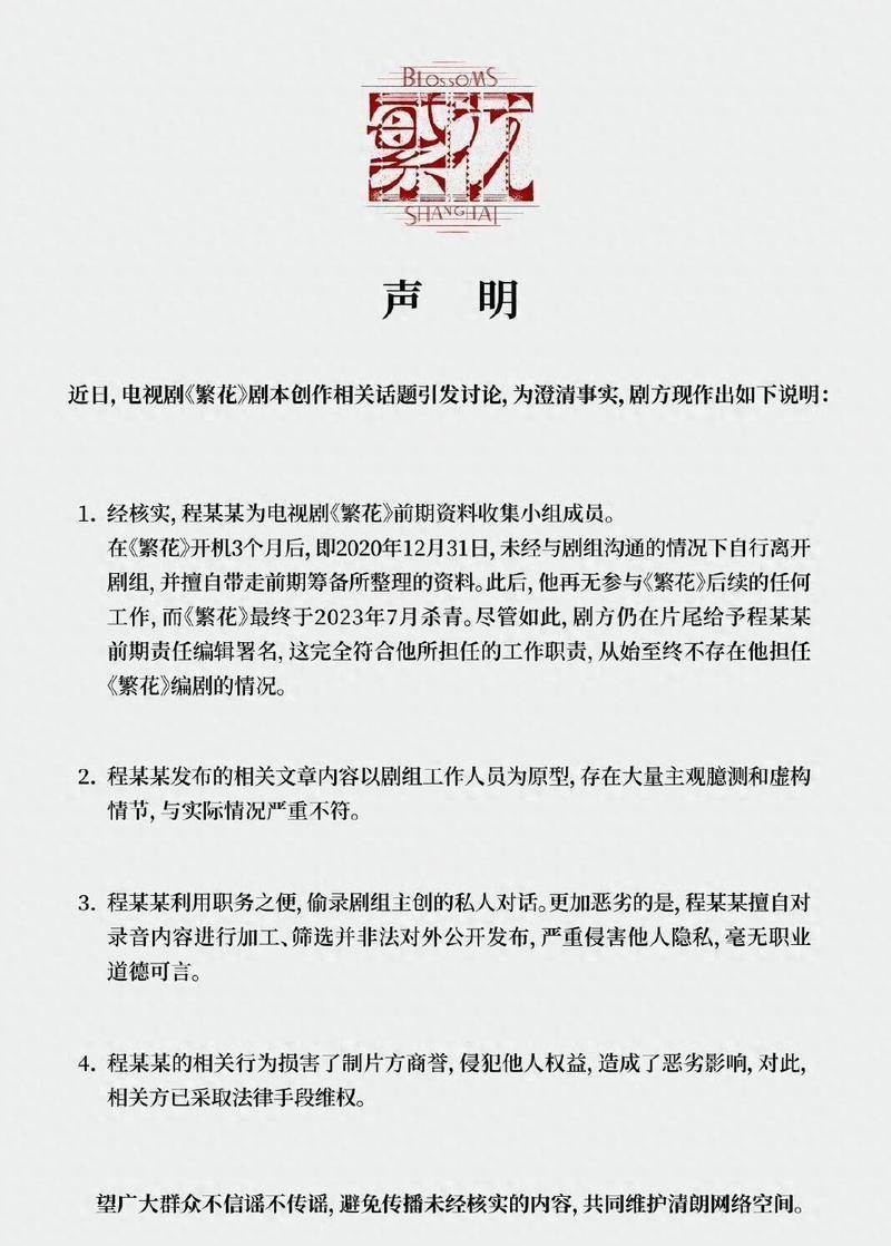 這件事情根本還沒有解決,只是《繁花》劇組發出一個不清不楚的聲明,古二的公眾號也被封禁。