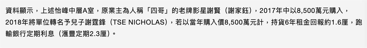 謝霆鋒自出道之後,在房產方面的投資就有不少,他還不只是為自己考慮,更是為家人考慮,其父母以及妹妹,他都有直接或是間接贈送過房產,形式上或是他買入轉贈,或是讓家人以個人名義買入,他作為背後金主支援。謝賢除了2017年持有的這套怡峰單位外,早些年在西半山幹德道金徽閣寓所也是謝霆鋒在2005年以1200萬買入的。