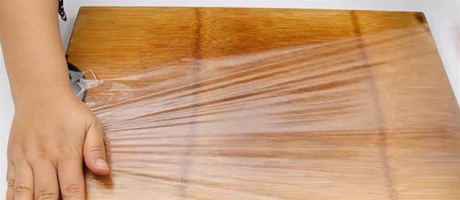 6. 用保鮮膜將菜板密封起來,靜置6個小時,讓食用油充分滲透到木頭里面。
