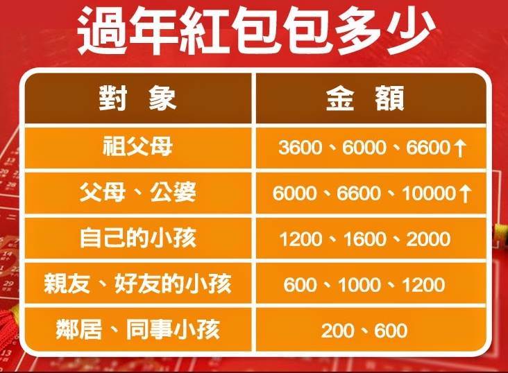 過年包紅包的金額由小到大為200元、600元、1,000元、1,200元、1,600元、2,000元、2,200元、2,600元、3,600元、6,000元、6,600元、10,000元、16,000元,會再根據對象的不同進行調整。