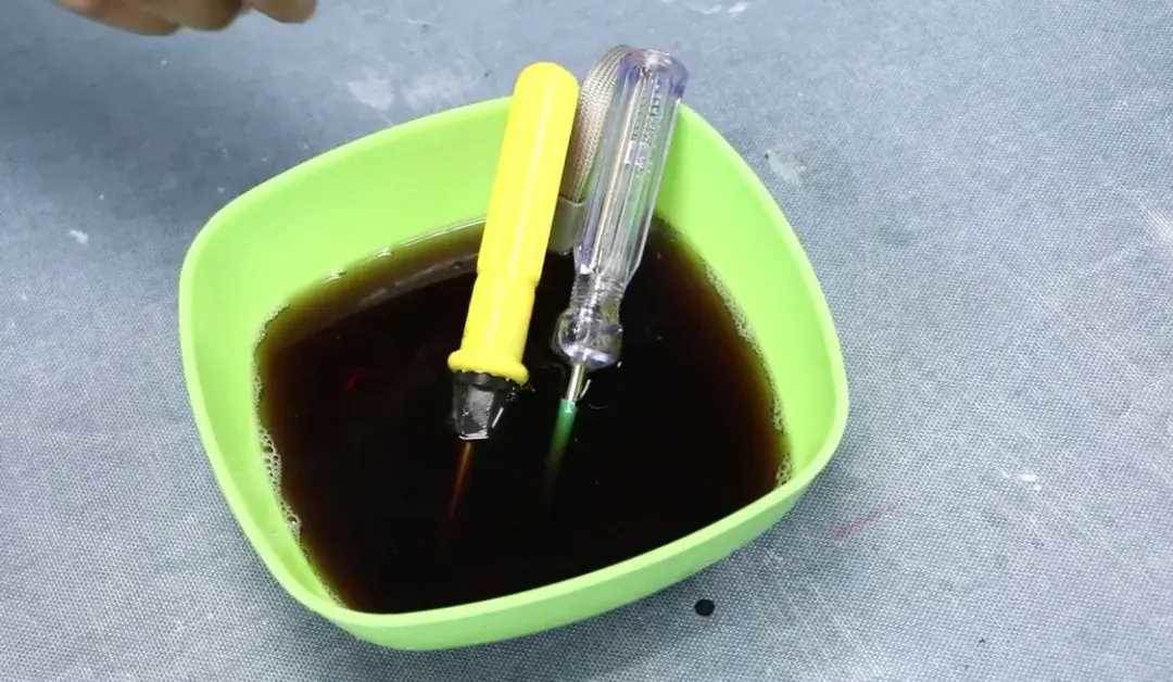 把我們這些生銹的東西全部放進去進行浸泡,我們讓它在里面浸泡二十分鐘。加入的洗潔精有非常好的清潔作用。而這個小蘇打它是堿性的,可以有效地去除一些銹漬。而可樂當中含有檸檬酸的成分,與小蘇打發生反應之后,也可以有效地去除銹劑浸泡二十分鐘之后,再把它們取出來。
