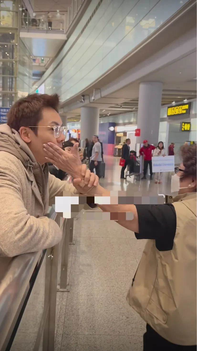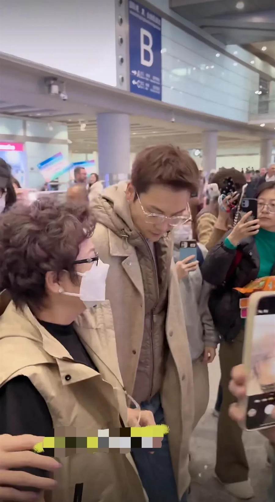 陳偉霆的媽媽身穿咖色馬甲,里面穿黑色短袖,這也是兒子官宣喜訊后特地飛北京來看望孫子和兒媳婦。