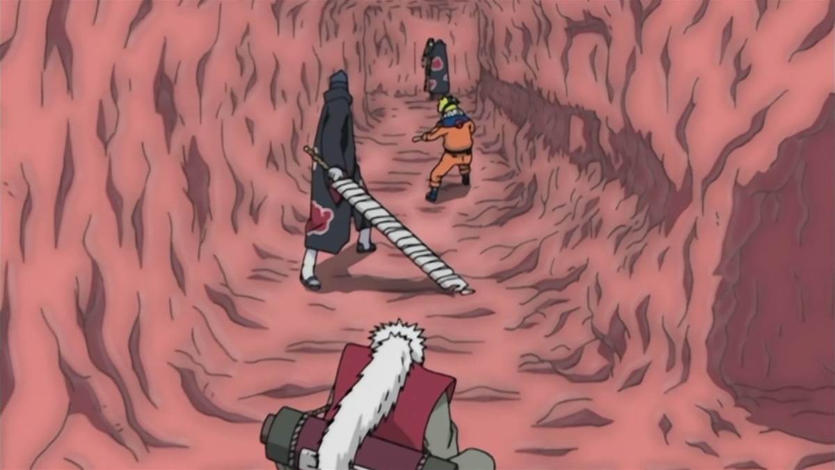 彼時來不及趕到的自來也緊急召喚出蛤蟆胃壁,將鬼鮫和鼬困住,本以為能夠甕中捉鱉的自來也,沒想到鼬用他萬花筒中的天照直接將蛤蟆胃壁燒出一個大缺口,兩人迅速逃之夭夭。