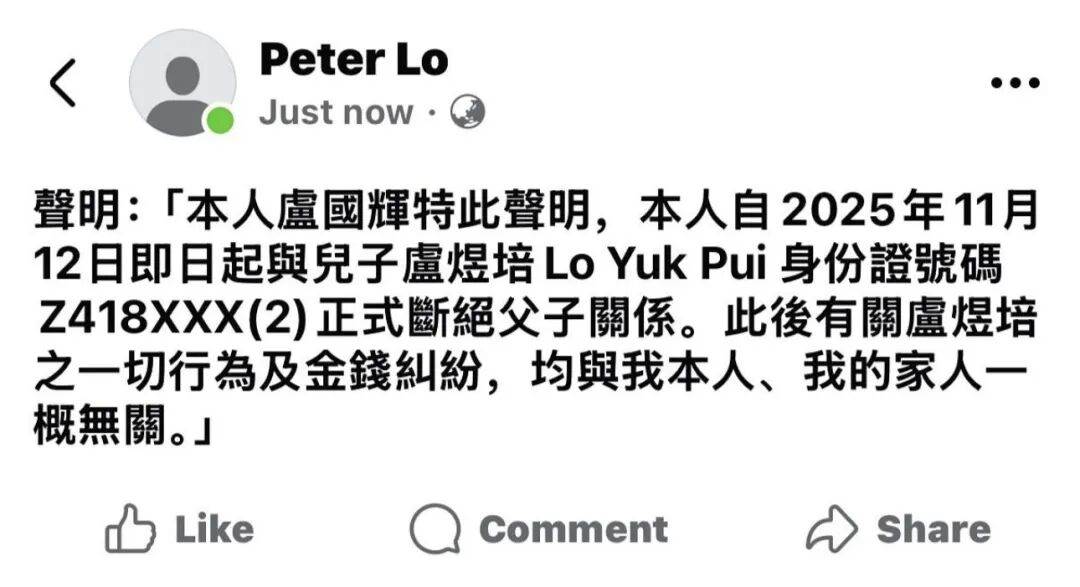 2025年11月12日,岳父盧國輝做出了一個讓人驚訝的決定,他發布公開聲明宣布與兒子盧煜培斷絕父子關系,告知公眾其以后的一切行為及金錢糾紛都與家人無關。