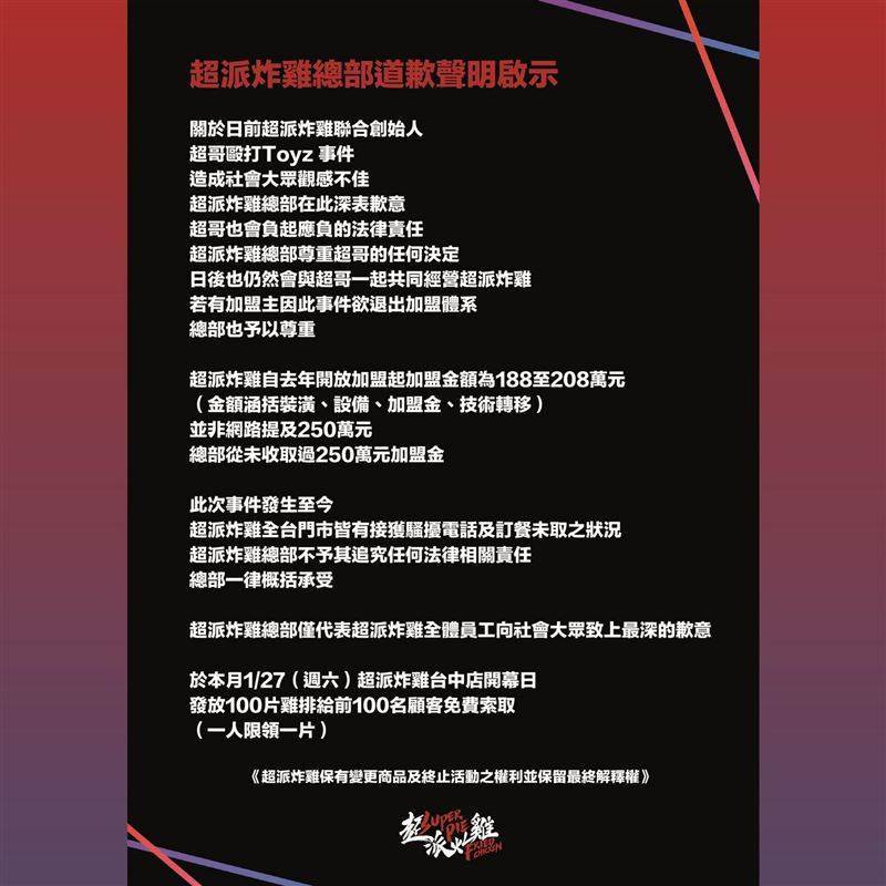 ▲超派炸雞發道歉聲明(圖/翻攝自臉書)