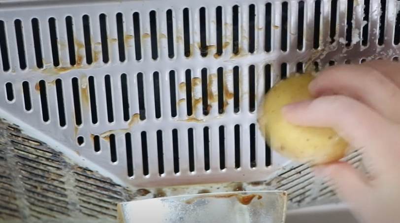 步驟二:用帶鹽的土豆擦拭油煙機上的污漬