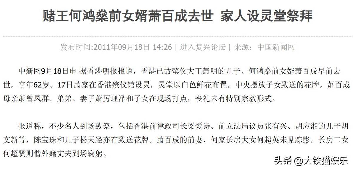 而蕭百成自從成了「前任」很少再曝光于媒體面前,最后一次被大眾知道是2011年他離開人世,媒體仍給用「賭王前女婿」來增加新聞吸引力。