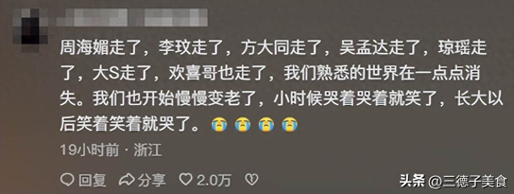 「周海媚走了,李玟走了,方大同走了,吳孟達走了,瓊瑤走了,大S走了,...,我們熟悉的世界在一點點消失。」