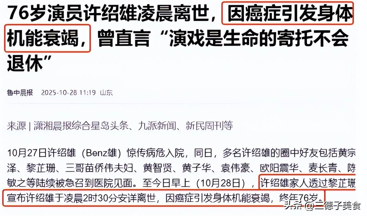 據悉,許紹雄是在10月28日,凌晨2點左右,因為癌癥,引發了器官衰竭,最終不幸離世。