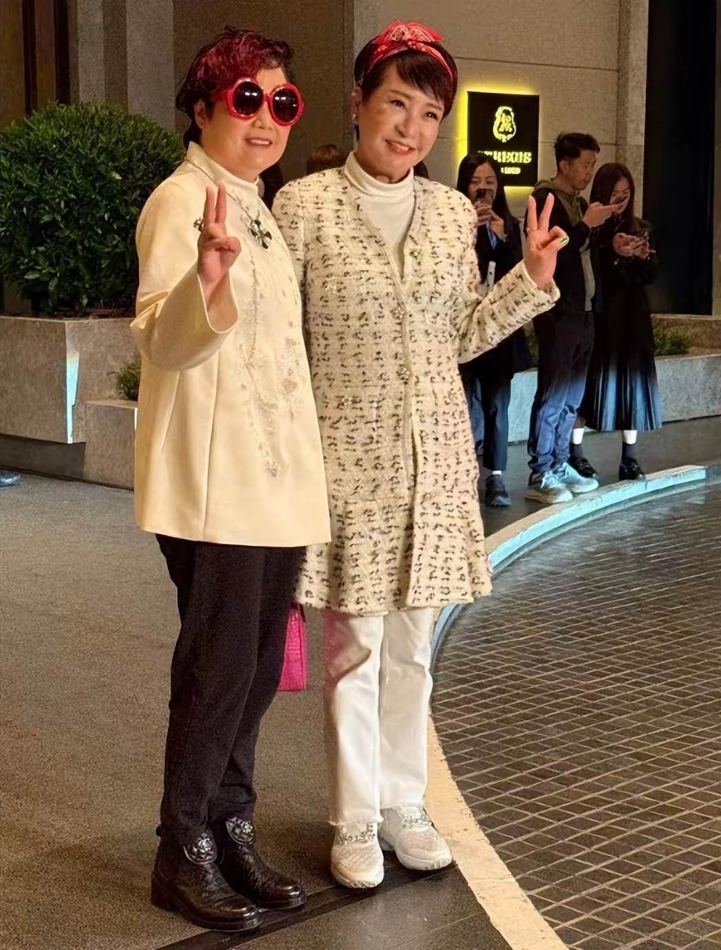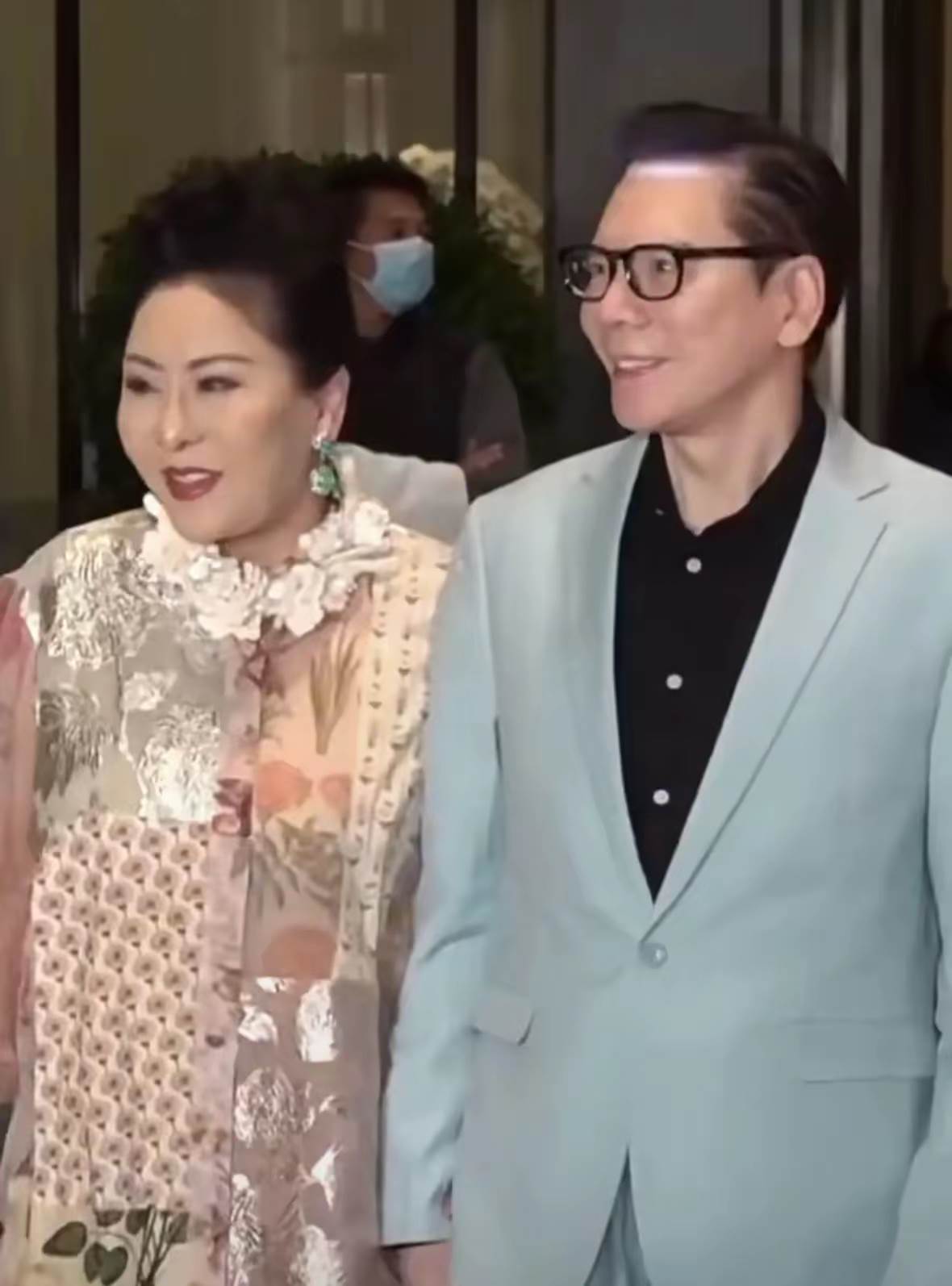 向太打扮的很貴氣,穿著宮廷風的連衣裙,戴著華麗的寶石耳環。向華強還是一如既往的帥氣,淺灰色西裝、黑色襯衫,更顯精神。