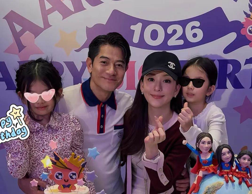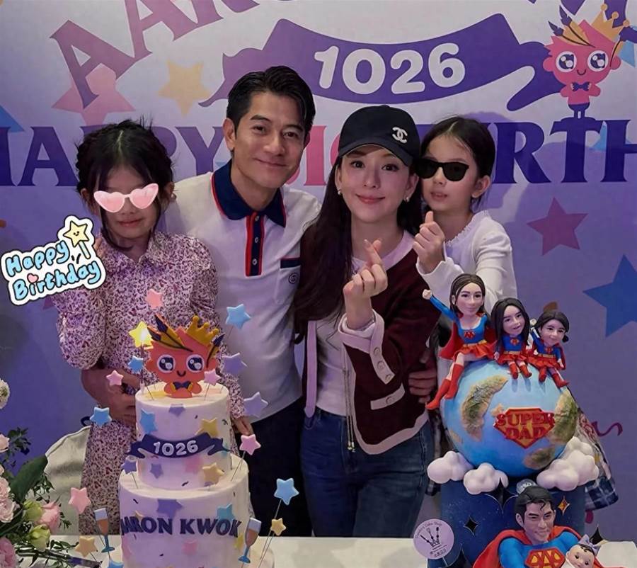 郭富城穿著白色polo衫,網友還以為是去年的舊圖!其實看蛋糕能看出來這就是今年的,生日蛋糕給他們都做成了超人,母女三人坐在地球上,郭富城抱著小baby,特別可愛。