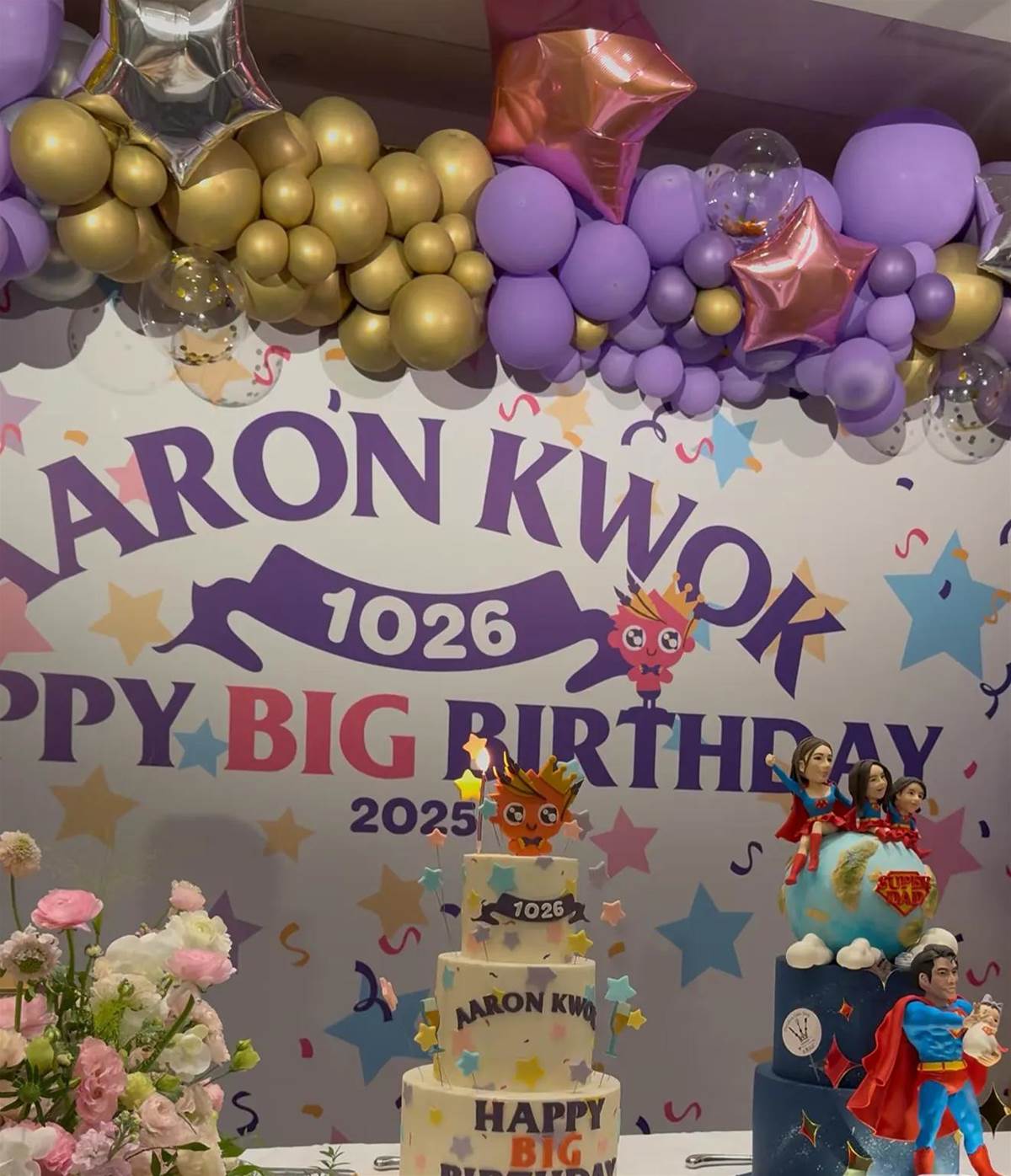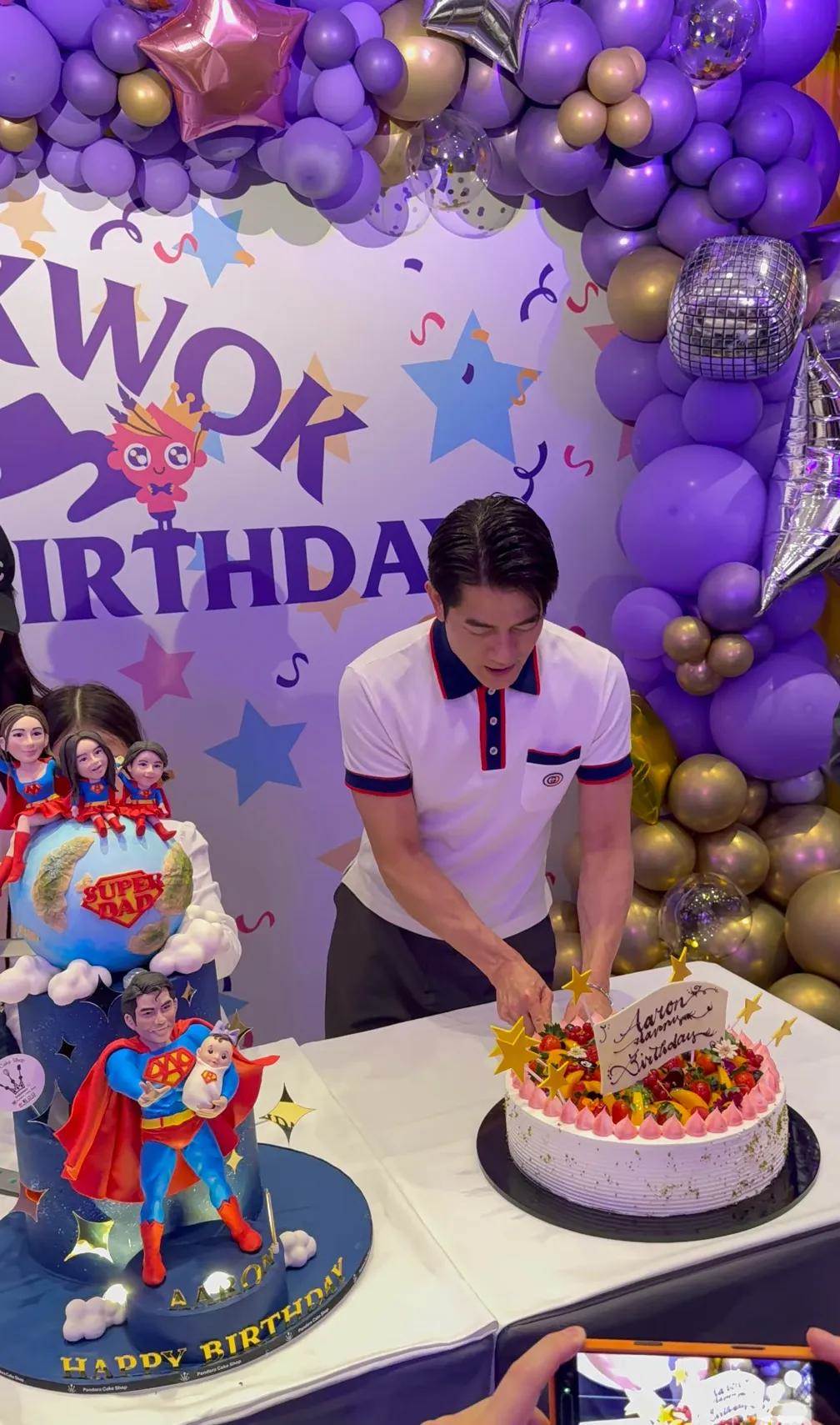 生日場地布置以紫色為主,生日蛋糕也準備了兩個三層的蛋糕,還有一個大蛋糕,雖然不是特別隆重,但也是儀式感十足,而且郭富城的家人都在身邊,就很幸福。
