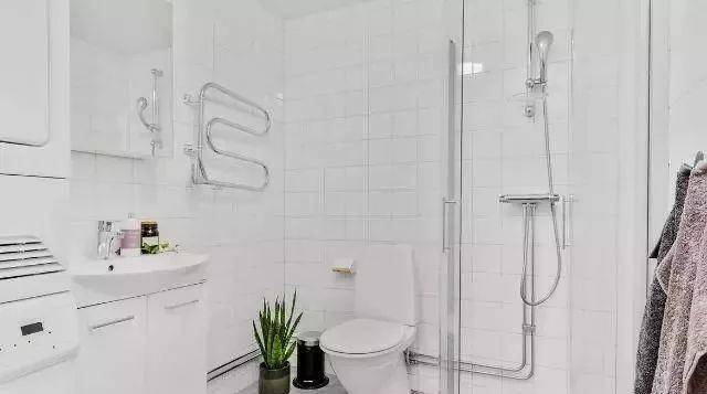 跟著戶型看,右手邊是衛生間。潔白的墻面、灰色地面,說實話有點白的刺眼。所以急需幾盆小綠植來調和一下色彩,小衛生間干濕分離做得不錯,還擠進了一台洗衣機。