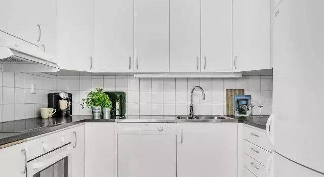 半開放式的巴掌大廚房,一不做二不休的上下全部裝櫥柜,從冰箱到水槽、切菜區、灶台,一串的流程很順手,而且這之間的距離還特合理。