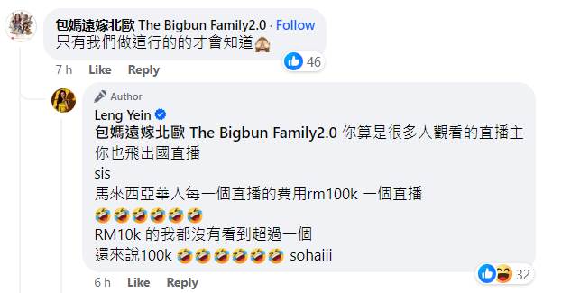Leng Yein在帖文中強調,目前大馬沒有任何一個直播平台或直播主的每一場收費都是RM100k的,就連王雷和吳宗憲來馬都沒有這樣的收費。
