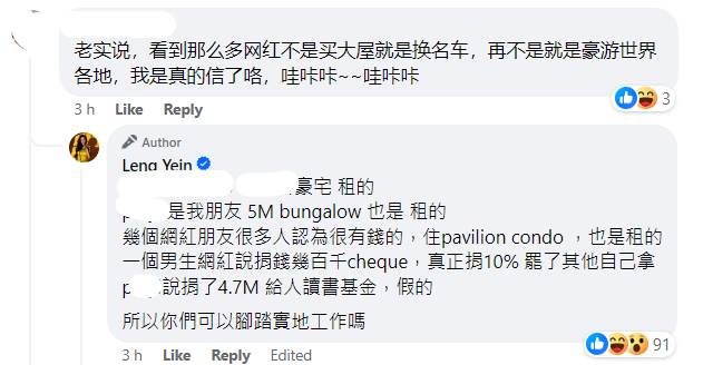 另外,有網友在Leng Yein的貼文底下留言,表示看到很多網紅不是買房就是換車,但Leng Yein揭發都是假的!