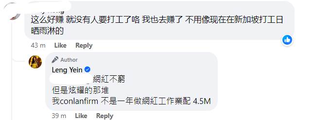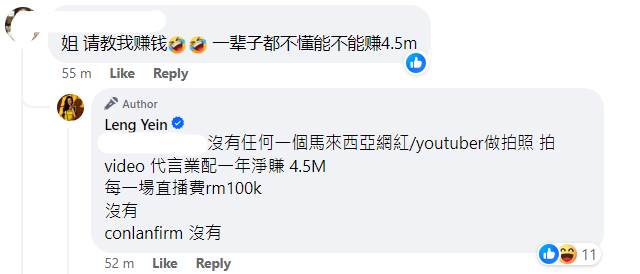 根據Leng Yein今天早上在Facebook的貼文,她直言目前沒有一個本地網紅可以靠拍照、拍影片、代言、拍廣告、直播等就能一年凈賺RM4.5M的本事。
