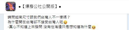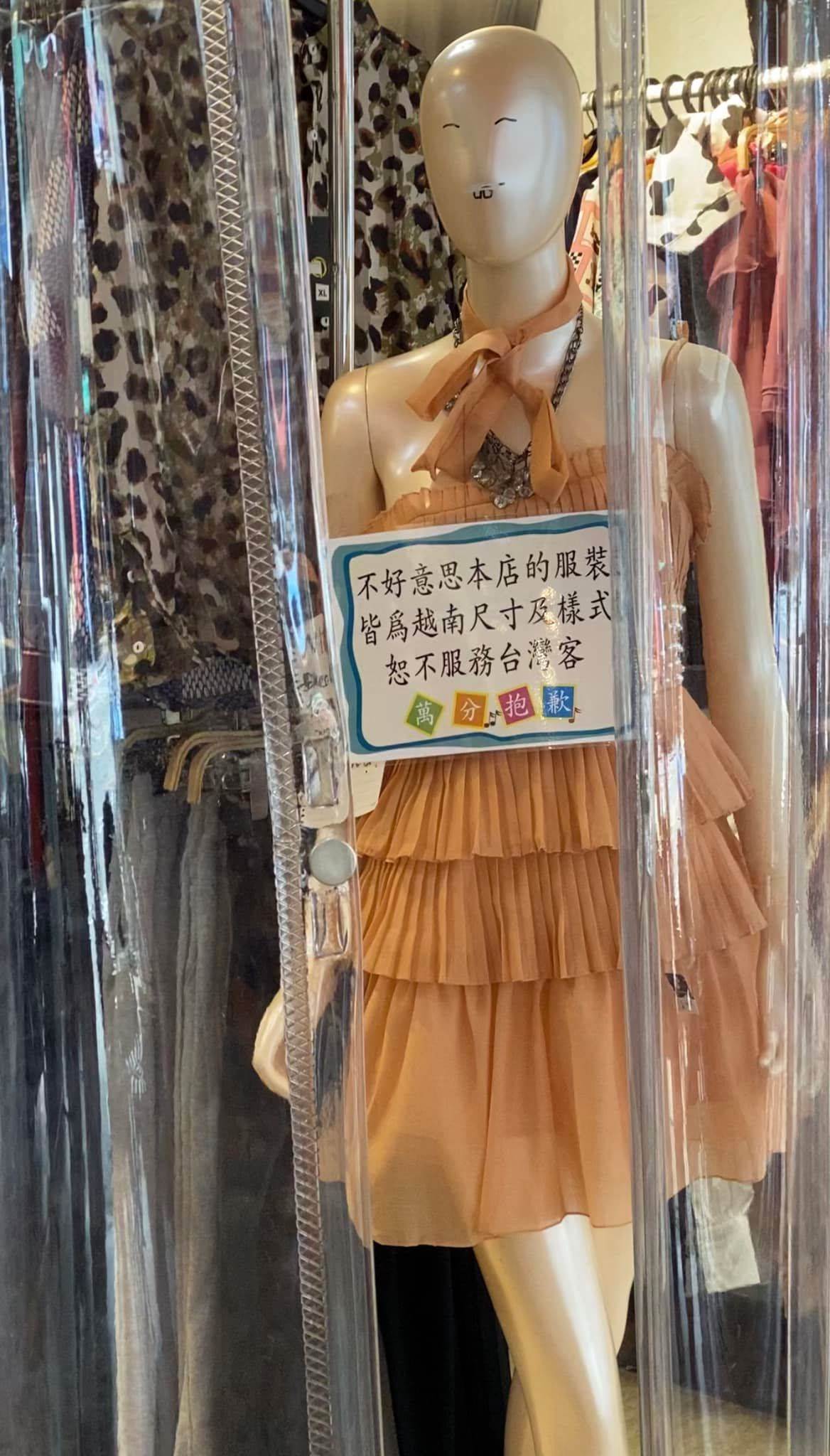 一名網友在臉書社團《爆廢公社公開版》上疑惑發文,她經過一間服飾店,竟發現店家在假人模特兒上貼了一張公告,「不好意思本店的服裝皆為越南尺寸及樣式,恕不服務台灣客,萬分抱歉」。她滿頭問號不解越南尺寸和台灣尺寸到底有哪裡不同,「為什麼開在台灣卻不接受台灣人?」