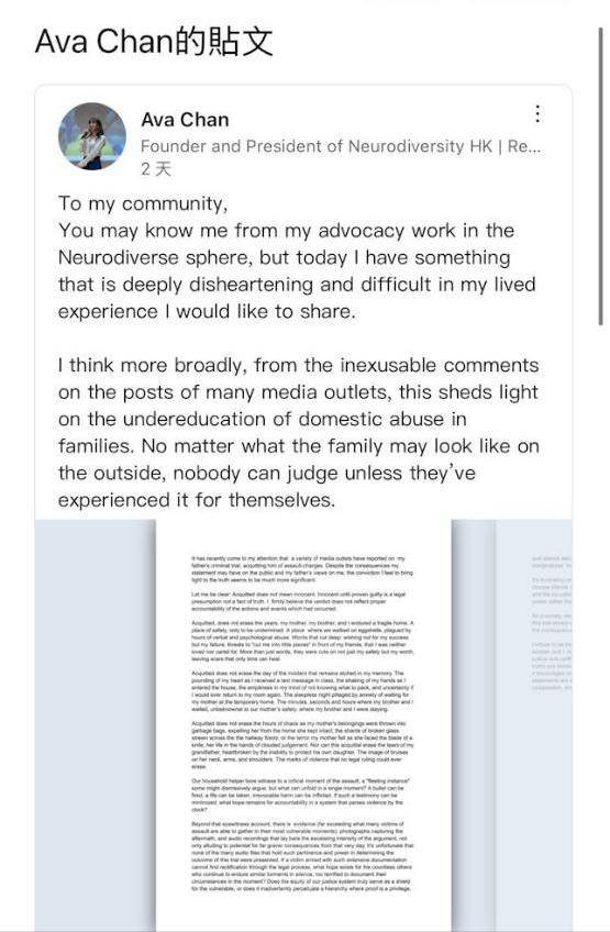 女兒Ava如今已是年輕人,她在社交平台勇敢發聲,詳細描述父親如何長期對她們進行精神控制和語言暴力。