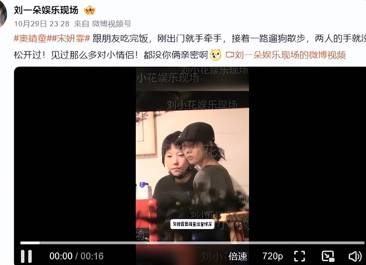 視訊中,竇靖童一手牽著繩遛狗,一手拉著宋妍霏,就連換手時也未曾松手。