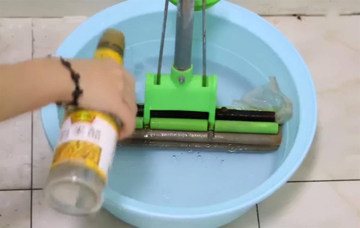 我們將臟拖把放在盆中,接著倒入一些溫水,記得水要沒過拖把頭,溫水可以軟化海綿,讓原本硬邦邦的海綿變得松軟不少。