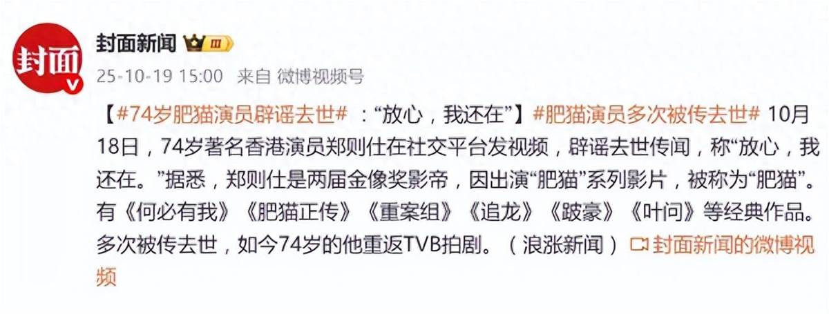 10月18日,香港演員鄭則仕在社交平台發布短視訊為自己辟謠,