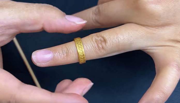 然後用食指輕輕地按在戒指上方,拇指放在戒指下方,開始輕輕地旋轉戒指並向外推,不要用力過猛以免手指腫脹導致戒指更難取下。