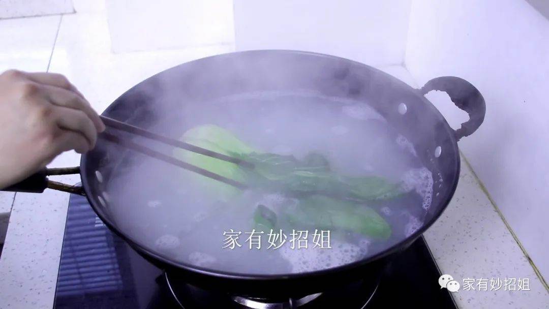 水燒開后,轉中小火,把我們清洗好的青菜燙一下,燙的時候先燙菜頭,菜頭比較大,我們將它燙上20秒左右,然后將整顆青菜都放進鍋里燙,用筷子翻動一下,使它受熱更加均勻。