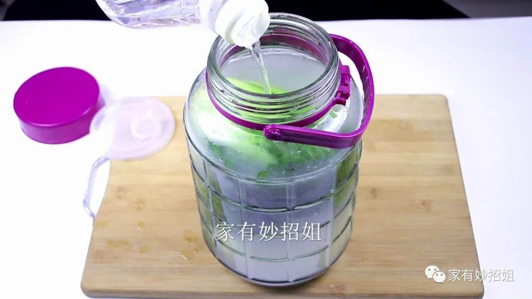 我們再準備一個干凈無油的密封罐,將放涼的青菜裝入密封罐中,然后再把放涼的淘米水也倒進來,淘米水要將青菜完全淹沒。