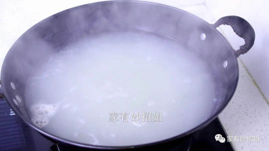 接下來,我們要準備最關鍵的淘米水,平時清洗大米的淘米水不要倒掉了,淘米水里面的營養很豐富,用它來做酸菜可以促進酸菜的發酵速度,做出來的酸菜口感也比較爽脆,而且顏色也會更加金黃好看。我們將淘米水倒在一個無油的鍋中,然后開大火,將淘米水燒開。