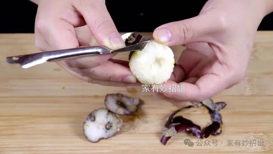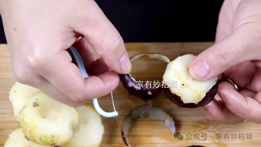 我們一手抓住馬蹄,一手抓住牙線,用牙線卡進果肉與果皮之間,然后順著果肉慢慢滑動,這樣一大塊馬蹄皮就被削了下來,簡單又快速。