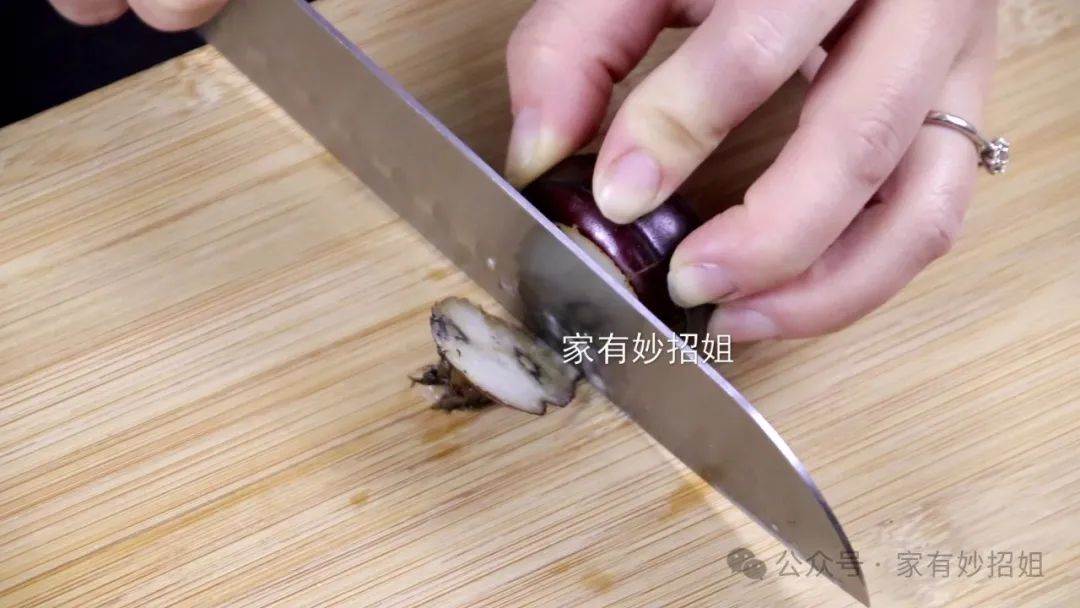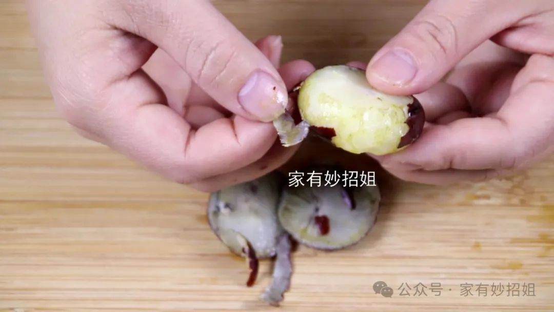 當馬蹄過完涼后,我們就可以來去皮了。先用小刀將馬蹄的頭尾都切掉一點,這樣就剩下了中間一圈果肉的部分,要是我們只是需要剝幾個的話,就只要用指甲一摳,就能把果皮給摳下來,非常的輕松。