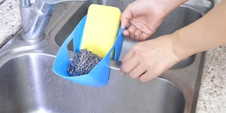 將它放在水槽中間的橫杠上,這樣就能方便地瀝水而不占用水槽的空間。