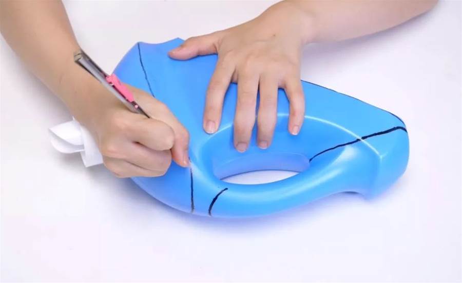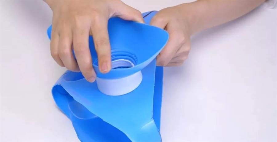 然后,按照標記的線條將角和長方形割掉,最終形成一個特殊設計的瓶子。這個改造后的洗衣液瓶子可以非常巧妙地用作瀝水架。