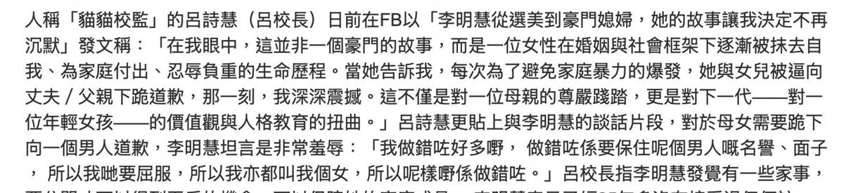 而在與丈夫撕破臉后,她罕見接受訪問,并且聊及豪門生活,聲稱要自己隱忍多年發聲,要為保護子女髮聲,換言之就是要撕破陳燿陽的真面目。李明慧在受訪中表示,過去幾十年的婚姻生活,自己一直為了保存丈夫的臉面,而對丈夫的家暴持續忍氣吞聲,直到如今走到一發不可收拾的地步,她才意識到只要公開真相才能得到平反的機會,保障家庭成員。
