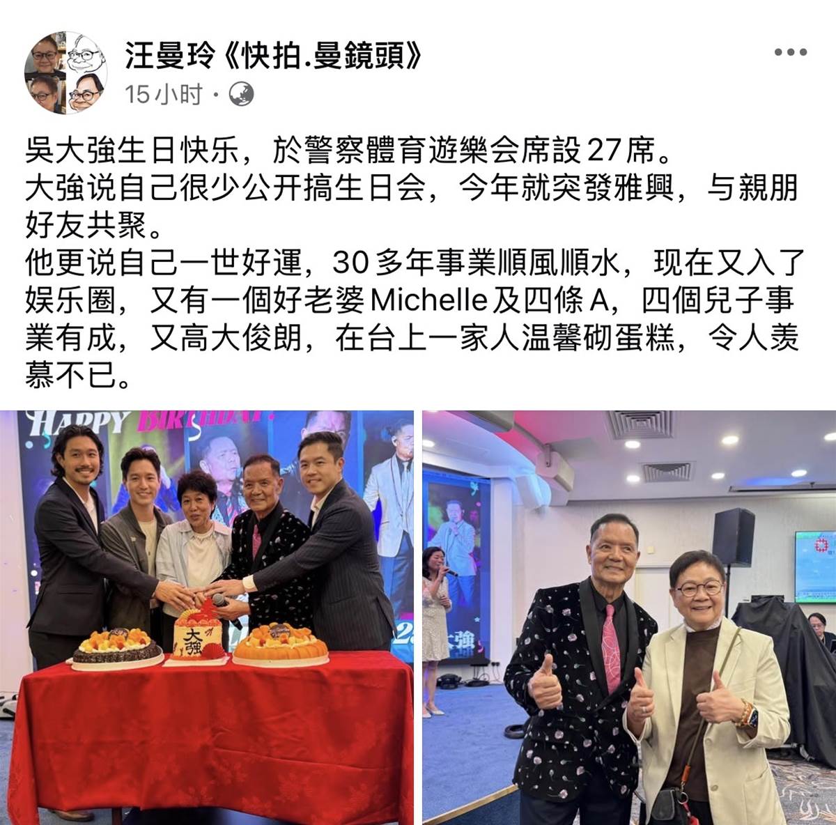 吳大強舉辦盛大生日會,他稱自己過去很少舉辦生日會,74歲生日突發雅興,想要與親友們共聚,所以才舉辦了這場盛大的生日宴。生日會的現場也并沒有特別布置,只是在舞台的大熒幕上放了吳大強參加歌唱比賽時的幾張照片,還寫上了「生日快樂」的英文字。吳大強當天打扮隆重,穿了花紋的黑色西裝,扎了粉色的花紋領帶,就像登台這般隆重。而切蛋糕環節是整晚的焦點所在,吳大強的家人一起上台參與儀式,在場可見吳大強的妻子,三個兒子都在場,而在眾人面前擺放了一個小推車,上面有三個蛋糕,其中兩個是陪襯,中間的蛋糕最特別,還寫上了「大強」二字。