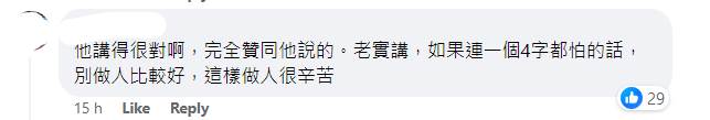 「完全贊同他說的。如果連一個4字都怕的話,別做人比較好。」