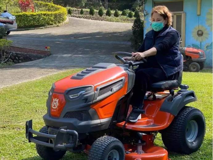 皮膚白皙,看得出保養得不錯。她穿著樸素,正坐在除草機上面,動作嫻熟,想必平時沒少干。