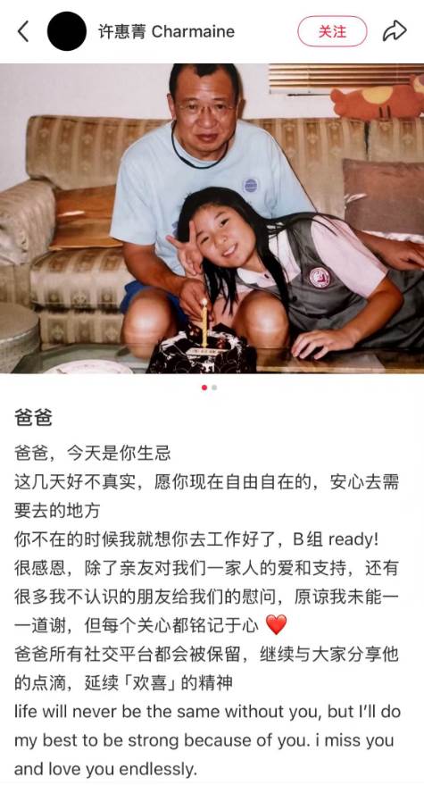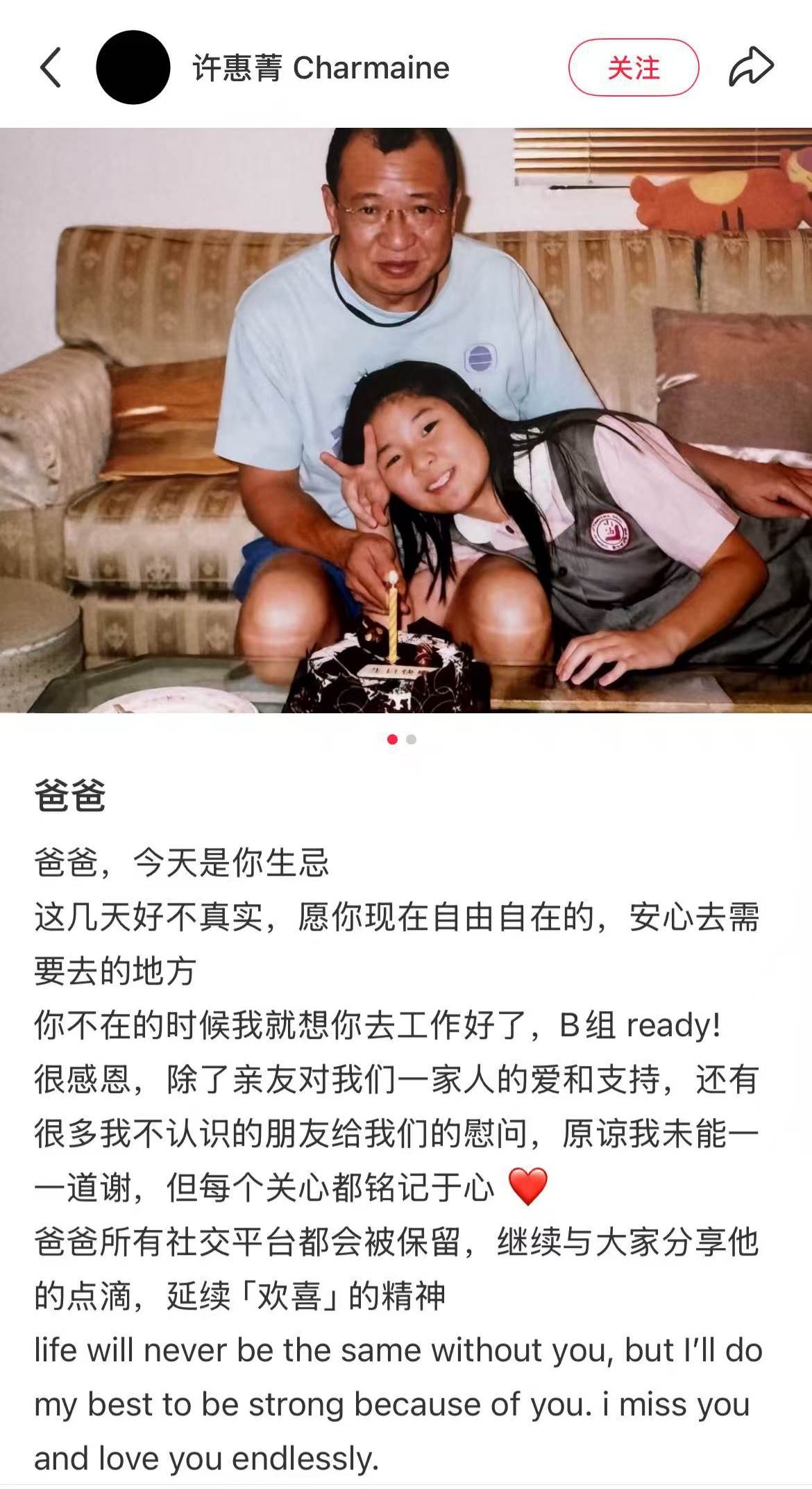 最后,許惠菁寫了一段英文來悼念父親,大意是:沒有你,我的生活將不再相同,但我會因為你而努力堅強。我無時無刻不在想念你,愛你。