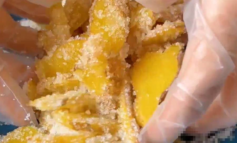 姜片均勻的裹上一層白糖,這個樣子就可以了。然后把它裝進干凈的容器里邊,最好是可以密封起來的容器,想吃的時候隨時都可以拿起來吃。