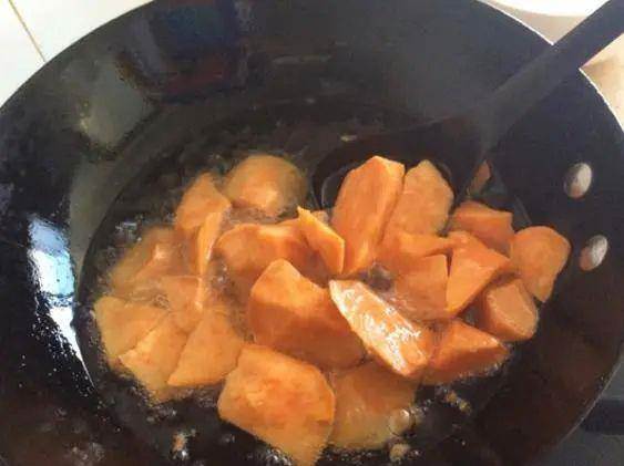 起鍋燒油,等到油溫升至5~6成熱的時候,把切好的地瓜放進油里面煎炸上10分鐘左右,等到內里炸透,表面變成金黃色時,地瓜就準備好了。