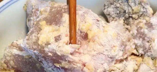 我們再往魚肉塊里面倒入適量的面粉,再繼續用筷子充分攪拌均勻,讓每一塊魚肉都均勻裹上一層面粉。這里放面粉的時候,可以稍微多放一些哦。
