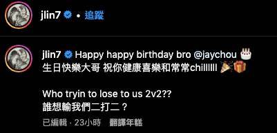 1月18日,正是周杰倫的45歲生日,他的好友林書豪在IG曬出兩人一同打網球的合照,寫下「生日快樂大哥,祝你健康喜樂和常常chillllll!Who tryin to lose to us 2v2?誰想輸我們二打二?」