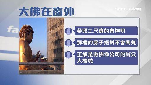 他說「廠商真是用心良苦」為了省空間竟在大樓旁立了一尊金色大佛像,讓住戶24小時貼身感受佛祖保佑,