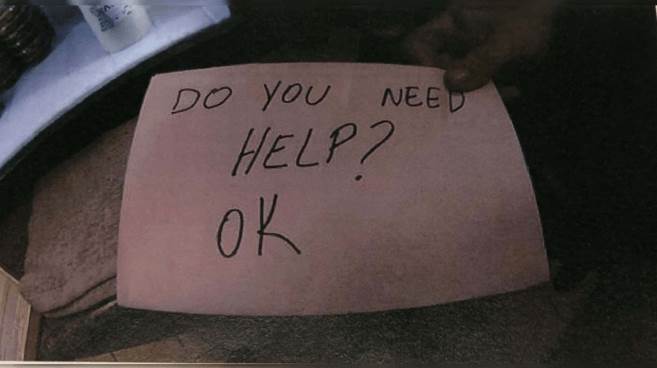 所以,為了不驚動男孩的父母,Flavaine想了想,決定拿一張白紙,在上面寫一句:你需要幫助嗎?然後站在這對父母身後,把紙舉起來給小男孩看。小男孩看到紙條後,剛開始是搖頭,拒絕幫助。但Flavaine感覺他可能是因為害怕,于是她又重新舉了一次,這一次,他點頭了。