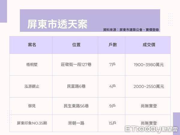 根據統計,目前屏東市透天案,預售、成屋都有,多為小基地新案,戶數也都不多,包括「梧桐墅」、「泓源觀止」、「御見」等,戶數都在10戶內,主力總價也要2000萬元起跳。