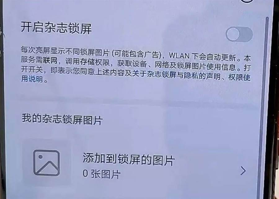 可以看到這個桌面和壁紙,我們點擊一下,在這里有一個雜志鎖屏,我們就點擊一下這個雜志鎖屏。所有手機的這個雜志鎖屏的功能的開關也都是默認開啟的。這里也有說這個每次亮屏顯示不同鎖屏圖片可能包含廣告,而且在wifi 情況下可能會自動更新。所以這個就會耗費我們手機的電量。如果你不需要的話,我們就可以把這個開關把它關閉就可以。確認關閉。