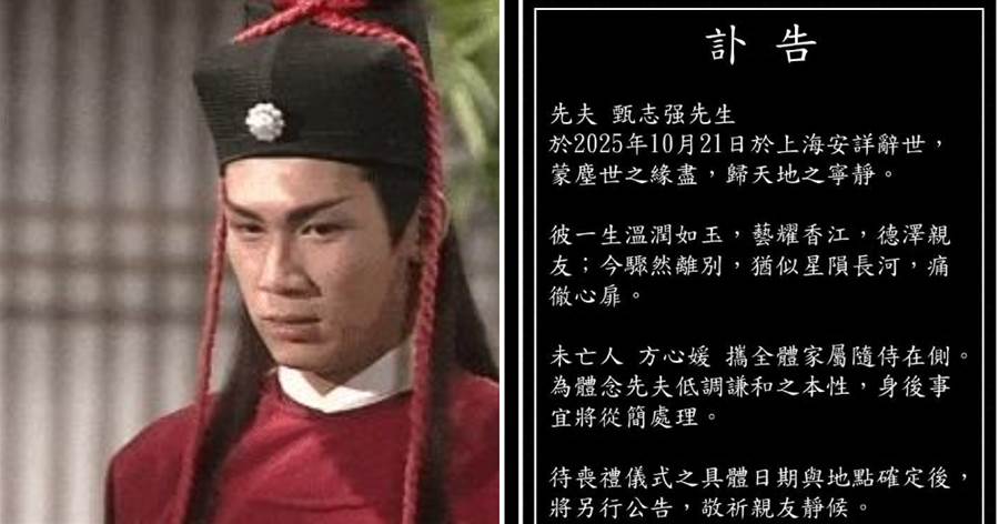 10月31日,香港演員甄志強的太太方心媛發訃文稱,甄志強已于2025年10月21日于上海安詳辭世,身后事宜將從簡處理。