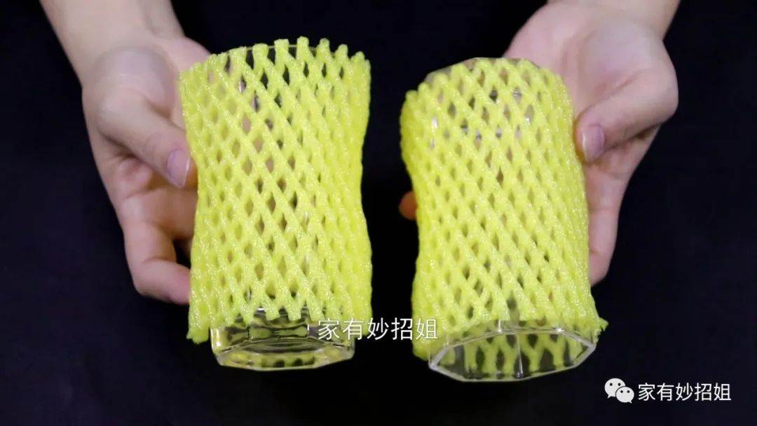 妙用一:隔熱。我們平常用來喝水的玻璃杯,很多都是沒有手柄的,這種玻璃杯如果裝了熱水,我們拿起來就會感覺非常的燙手。那麼這個時候,我們就可以利用上一個水果網套,只需要把水果網套直接套在杯子的外面,由于網套是塑料的,而且有一定的厚度,就可以起到一個隔熱的作用。