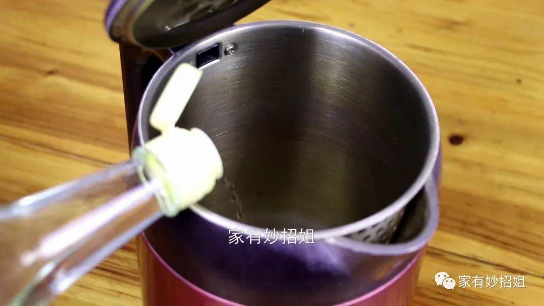 水壺底部產生水垢,其實是一種很正常的現象,是由于水中的鈣、鎂離子沉淀而形成的。可能很多朋友也嘗試去清洗,但普通的方法根本不能將這層水垢去除干凈。遇到這個問題,我們利用上一點白醋就可以解決了,我們先在水壺里面倒入多一些的白醋。
